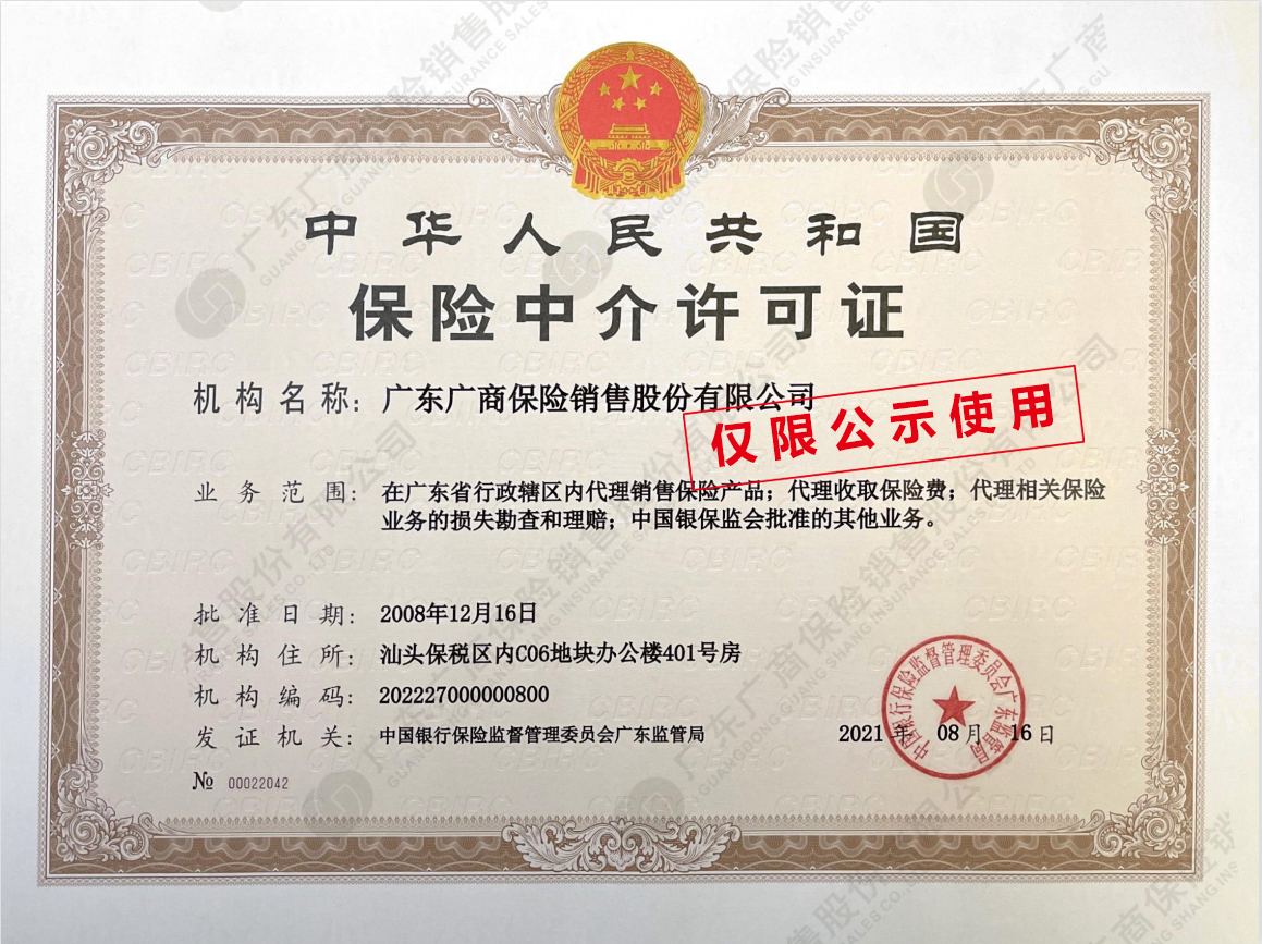 - 根據(jù)中國(guó)銀行保險(xiǎn)監(jiān)督管理委員會(huì)的規(guī)定,廣東廣商保險(xiǎn)銷(xiāo)售股份有限公司因經(jīng)營(yíng)場(chǎng)所變更換證,已由中國(guó)銀行保險(xiǎn)監(jiān)督管理委員會(huì)廣東監(jiān)管局換發(fā)新的《保險(xiǎn)中介許可證》,現(xiàn)予以公告。